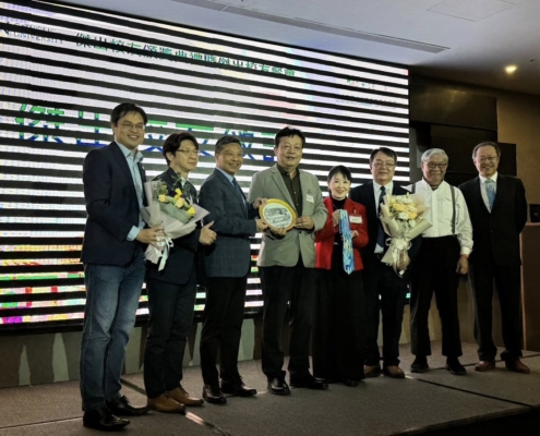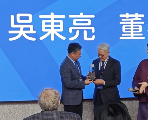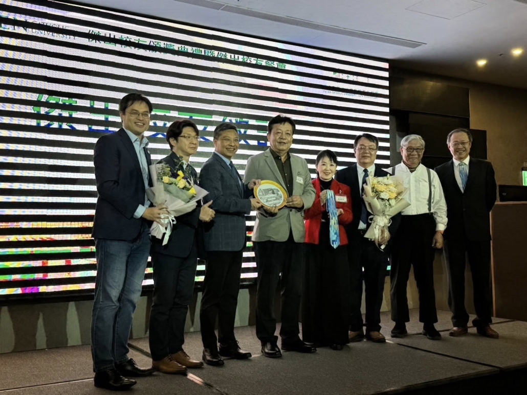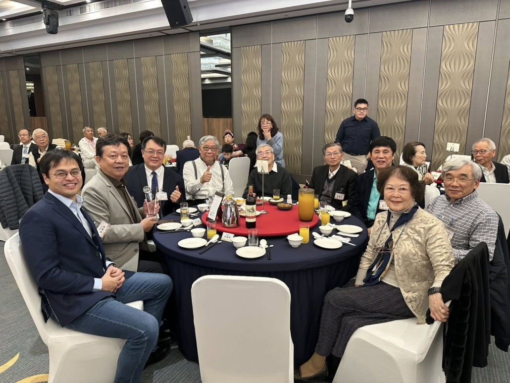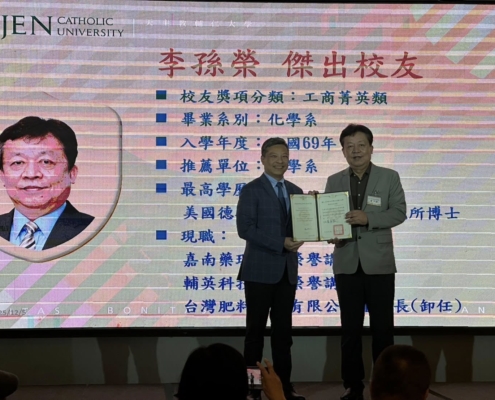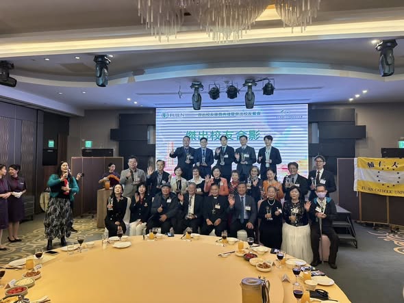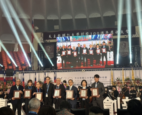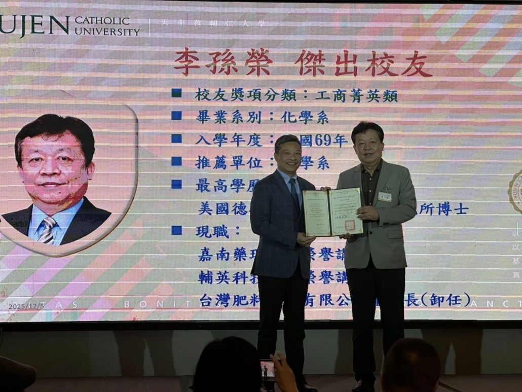 12/5 輔仁 100 校慶晚宴, 李孫榮學長(曾任嘉南藥理大學校長及台肥董事長)獲頒輔仁傑出校友。裘國英學長(第四屆, 113傑出校友) 與 曾毓俊學長(第五屆,105傑出校友)參與聚餐頒獎。輔化系主任游源祥教授與劉維民教授陪同李學長獲獎。